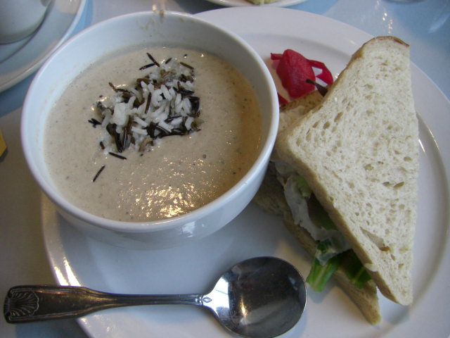 マッシュルームのスープとチキンサラダのサンドイッチ。