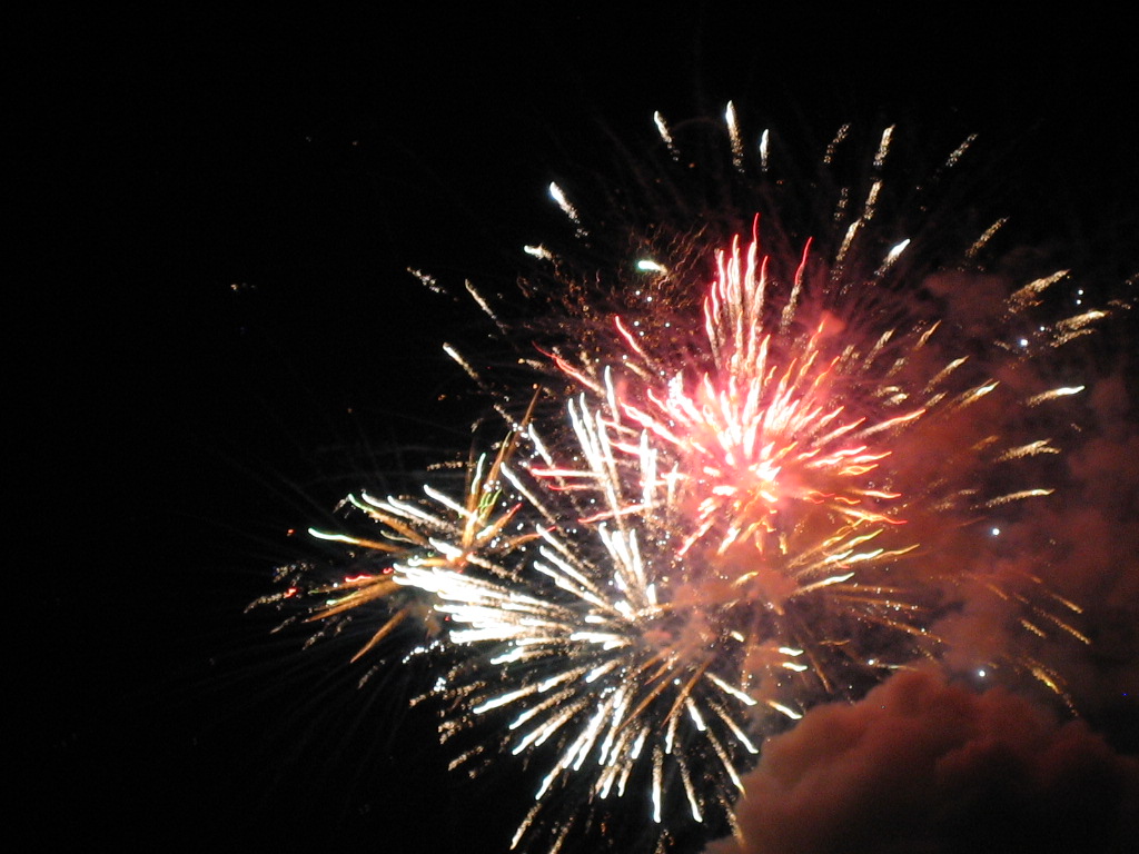 今日は独立記念日。 暗くなり始めた途端、 あちらこちらで花火が上がりました。 これはお庭から見た花火です。 風下で沢山の花火が上がったので 花火が終わって静まり返ったら 家の周りは煙で雲ってました。 ついでに、焦げ臭いような 花火の匂いが漂ってたの。 庭のどちらの方向を向いても 花火が音を立てて上がってて 自分で買わなくても 毎年、十分楽しめてます。 奇麗でしたよ~。